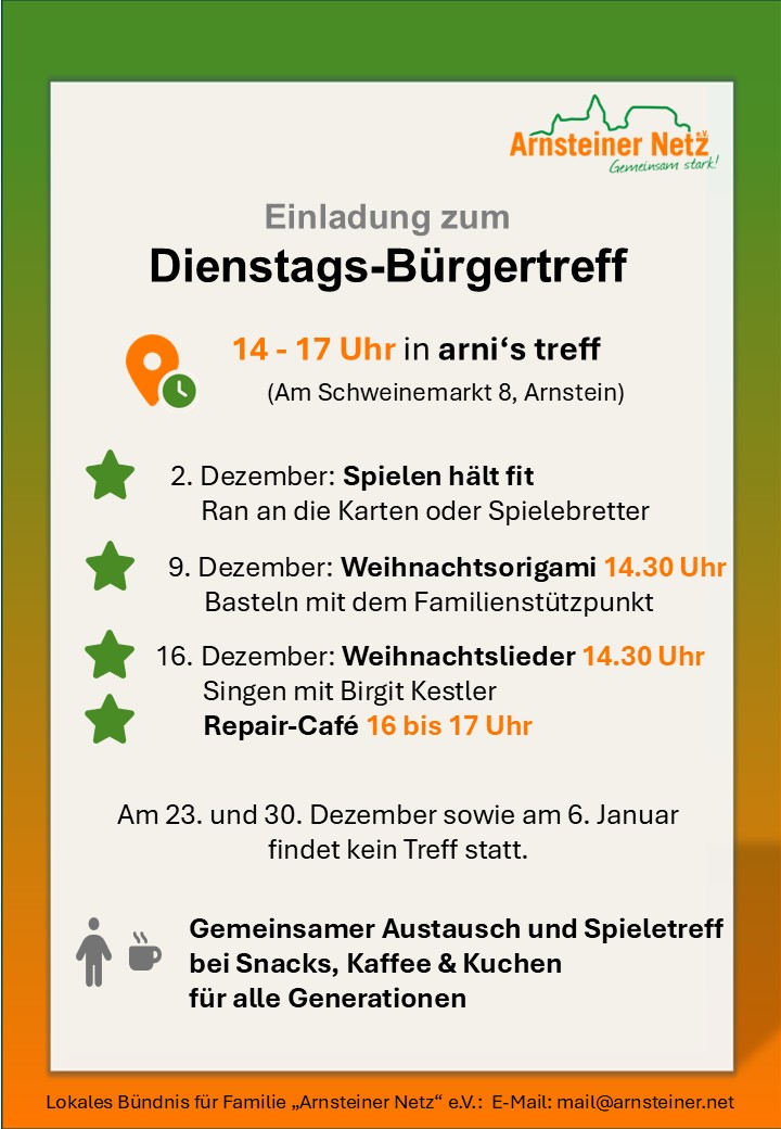 Monatsprogramm Dezember Dienstags-Bürgertreff Matthias Fabian2025-11-23T20:45:32+02:0023.11.2025|Aktuelles| Auf anderen Plattformen teilen ... FacebookTwitterE-Mail Ähnliche Beiträge Monatsprogramm September Dienstags-Bürgertreff Monatsprogramm September Dienstags-Bürgertreff Monatsprogramm Juni Dienstags-Bürgertreff Monatsprogramm Juni Dienstags-Bürgertreff Monatsprogramm Mai Dienstags-Bürgertreff Monatsprogramm Mai Dienstags-Bürgertreff Monatsprogramm April Dienstags-Bürgertreff Monatsprogramm April Dienstags-Bürgertreff Monatsprogramm März Dienstags-Bürgertreff Monatsprogramm März Dienstags-Bürgertreff